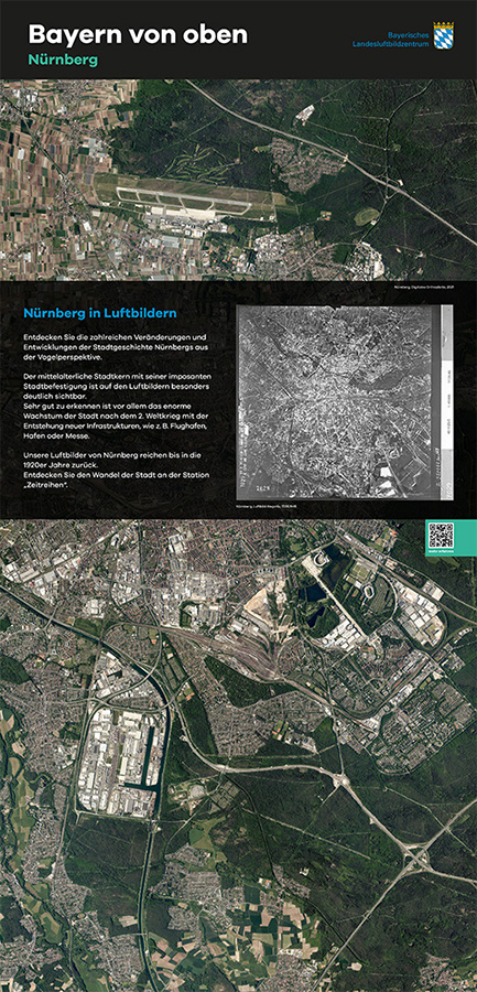 Anlässlich des fünfjährigen Bestehens des Bayerischen Landesluftbildzentrums stellte die Wanderausstellung dessen Angebote einem breiten Publikum vor. Die multimedial gestaltete und leicht verständlich aufbereitete Ausstellung vermittelt einen spannenden Einblick in die Geschichte und Technik der Luftbildfotografie. Auf 14 Ausstellungstafeln wurde den Besucherinnen und Besuchern gezeigt, wie Luftbilder gemacht werden, wie sie aufbereitet werden und wo sie eingesetzt werden.